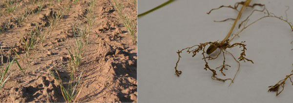 Low pH and poor root growth. Many potential causes exist for reduced root growth: dry soils and later sowing are common situations this year. Root damage due to aluminum toxicity in acidic soils can also result in multiple deficiency symptoms and poor growth (Figure 3). Strongly acidic soils may present several problems for wheat production. These include the combination of aluminum toxicity and phosphorus, calcium, magnesium, and molybdenum deficiencies. These problems caused by acid soils are difficult to separate from one another and are often related to root damage due to Al toxicity. In general terms, aluminum toxicity will reduce the yield potential of wheat when soil pH levels get below 5.2 to 5.5, and KCl-extractable (free aluminum) levels are greater than 25 parts per million (ppm).