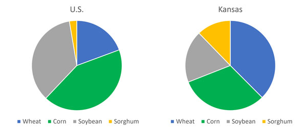 Figure 1. Proportions of the four largest crops planted in the U. S. and Kansas in 2025. Graphs based on acreage reported to the Farm Service Agency.