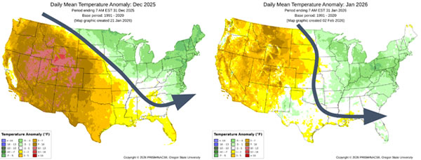 Figure 1. Monthly temperature anomalies for December 2025 (left) and January 2026 (right), and the prevailing jet stream for each month annotated. Source for images is PRISM (https://prism.oregonstate.edu/comparisons/anomalies.php) with annotations by Chip Redmond, K-State Extension.