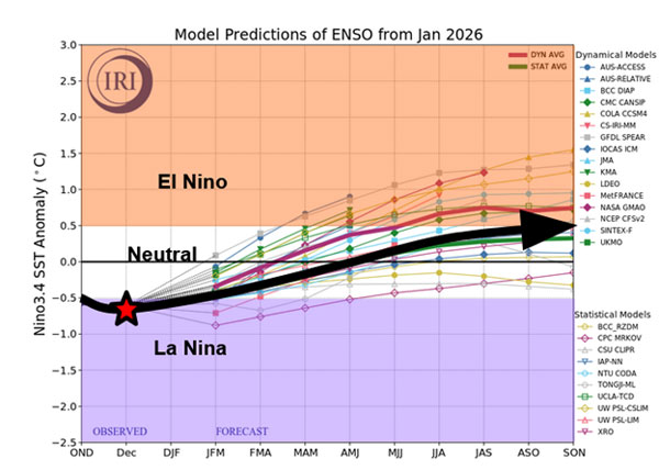 Figure 2. Current analysis (star) and overall projection of the El Niño Southern Oscillation for the coming months (black arrow). Data from IRI (https://iri.columbia.edu/our-expertise/climate/forecasts/enso/current/) annotated and edited by Chip Redmond, K-State Extension.