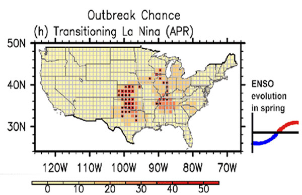 Figure 3. Areas that favor increased probability for tornado outbreaks during winter La Niña April transitions to El Niño. Source:  https://www.gfdl.noaa.gov/research_highlight/u-s-regional-tornado-outbreaks-and-their-links-to-spring-enso-phases-and-north-atlantic-sst-variability/.