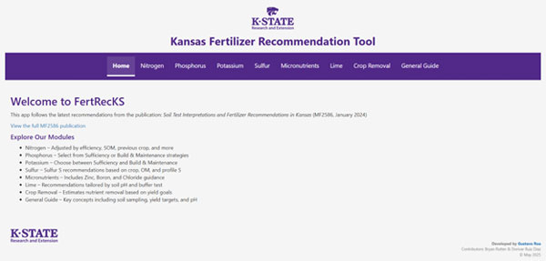 The Fertilizer Recommendation Tool is a web-based application designed to apply the fertilizer recommendation procedures described in Soil Test Interpretations and Fertilizer Recommendations in Kansas (MF2586). The tool is organized into modules (tabs) for each nutrient and includes a general user guide (Figure 1). This lightweight application is particularly useful for quick “on-the-go” calculations, as it is mobile-friendly and does not require a download.