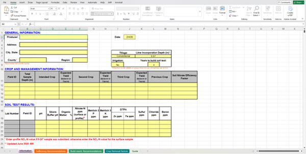 Figure 2. Screenshot of the Excel-based fertilizer recommendation program showing organization of field information, soil test results, and management inputs.