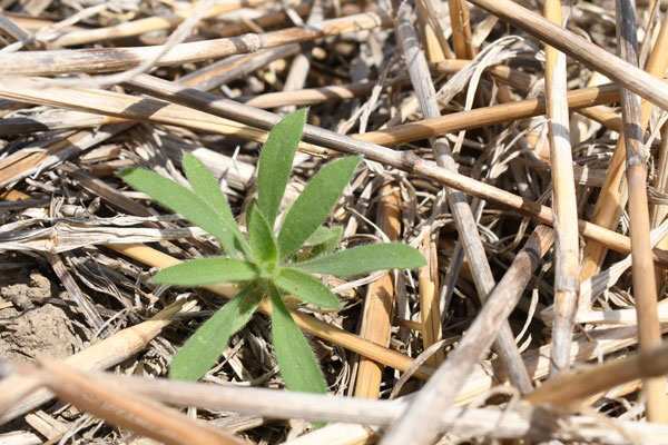 Figure 1. A young kochia seedling in wheat residue. Photo by Sarah Lancaster, K-State Extension.