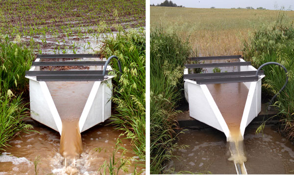 Figure 1. Runoff event from a non-cover crop plot (left) and a cover-crop plot (right) in a corn production field. Runoff water from the cover crop plot is clearer than the no-cover-crop plot, visually indicating reduced sediment loss with the cover crop. Photos from K-State Department of Agronomy.
