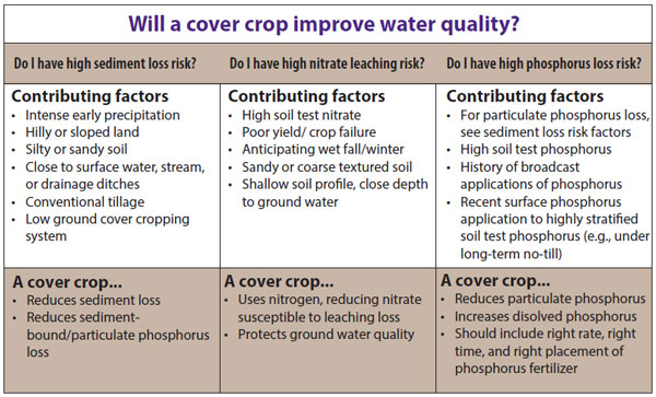 Figure 2. Situations leading to sediment, nitrate, and phosphorus losses, and ways a cover crop reduces the risk of loss. Graphic from K-State Extension publication MF3686.