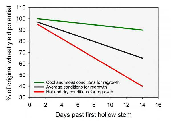 If the wheat has reached FHS, cattle should be removed to prevent grain yield loss. Yield losses from grazing after FHS can range from 1 to 5% per day, depending on grazing intensity and the weather following cattle removal (Figure 2). If cattle removal is followed by cool, moist weather, yield losses will often average about 1% per day grazed after FHS; if weather is hot, dry, and harsh, yield losses of 5% per day or more can be expected. It is easy for producers to be late by a few days in removing livestock as they wait for obvious nodes and hollow stems to appear, and even the first few days can be significant.