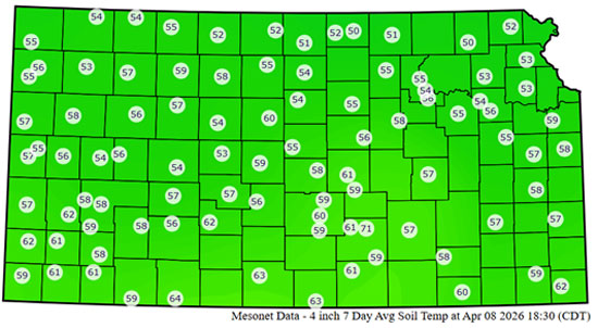 Figure 1. Average 7-day 4-inch soil temperatures (°F) as of April 8, 2026. Data and image courtesy of Kansas Mesonet (mesonet.k-state.edu).