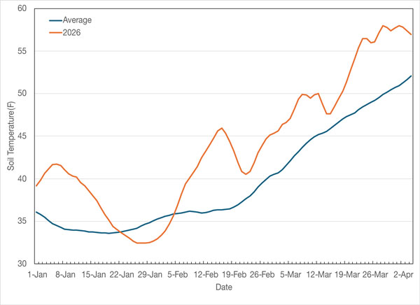Figure 2. Seven-day average and 2026 daily 2-inch soil temperatures. Dates plotted represent the midpoint of the 7-day average period. Graph created by Matthew SIttel, K-State Extension.