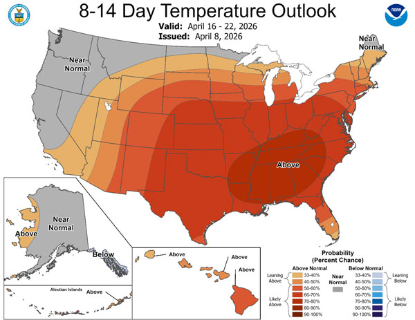 Figure 3. The Climate Prediction Center’s 8 to 14-day temperature outlook for the period April 16-22, 2026. Source: NOAA Climate Prediction Center.