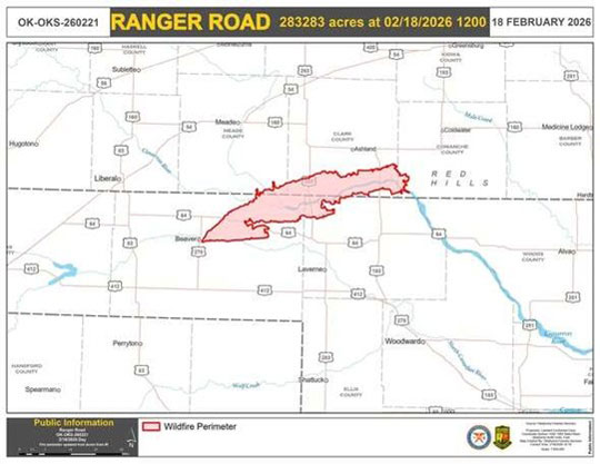 Figure 2. Aftermath of the Ranger Road Fire in Clark County (top) and the fire perimeter extending from Oklahoma into Kansas (bottom). The fire is contained as of this publication and burned approximately 280,000 acres. Images courtesy of Dr. Randall Spare (top) and the Oklahoma Forest Service (bottom).