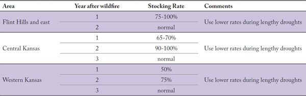 Table 1. Stocking rate guidelines for pastures burned by wildfire occurring any time other than late spring, from K-State Extension Publication “Rangeland Management Following Wildfire” (L514).