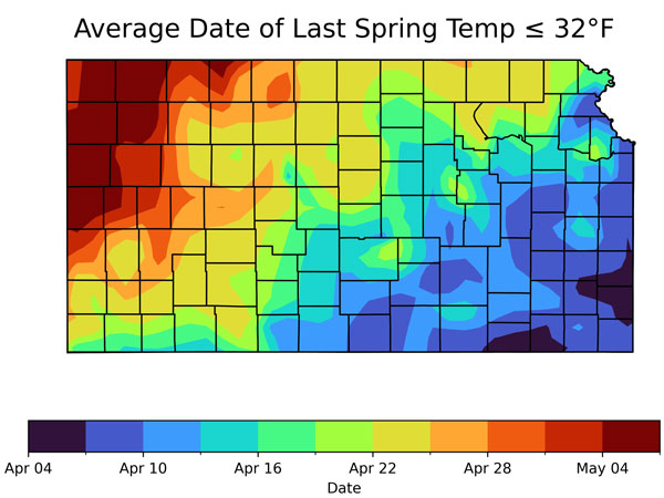 Figure 6. Average last spring freeze (32 degrees F) for Kansas. Source: Kansas Mesonet. Map created by Matthew Sittel.
