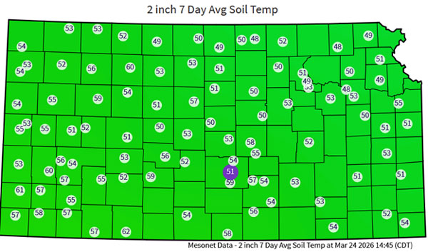 Figure 1. Average soil temperatures at 2-inch soil depth for the week of March 17 to 24, 2026. Source: Kansas Mesonet. (https://mesonet.k-state.edu/agriculture/soiltemp/)