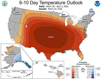 Figure 2. 6 to10-day temperature outlook for March 30 – April 3, 2026. Source: NOAA.