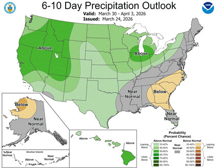 Figure 3. 6 to10-day precipitation outlook for March 30 – April 3,2026. Source: NOAA.