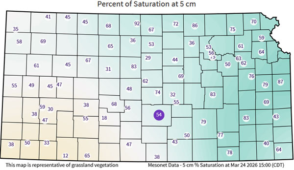 Figure 4. Soil moisture as percent of saturation at 2 inches (5 cm) as of March 24, 2026. Source: Kansas Mesonet https://mesonet.k-state.edu/agriculture/soilmoist/