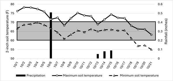 Figure 2. Temperature and rainfall observed at Ashland Bottoms Research Farm near Manhattan, KS. Henbit emergence is greatest when soil temperatures are between 60°F and 70°F (gray shaded area).