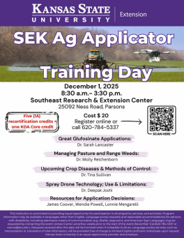 K-State's Southeast Research and Extension Center will host a one-day Ag Applicator Training on Monday, Dec. 1, in Parsons. Participants can earn five 1A credits and one Core credit while learning about glufosinate application, pasture weed control, crop diseases, and spray drone technology.