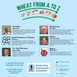 Make plans to attend the Kansas Seed and Crops Conference, February 17–18, in Manhattan. Join the seed industry for networking, updates, and the "Wheat from A to Z" panel that follows wheat from breeding to baking and is open to the public.
