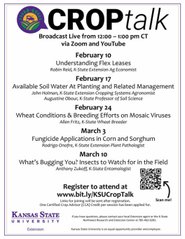 The popular K-State Crop Talk online webinar series is back and set to start on February 10, 2026. The Crop Talk series will highlight several topics important to crop producers in north central and northwest Kansas. Each webinar will begin at 12:00 pm (CST) and last until 1:00 pm.
