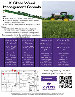 Join K-State weed science experts for a series of Weed Management Schools across northwest and north central Kansas, February 16–20. Sessions will focus on high‑priority weeds, cost‑effective control strategies, and updates from the 2026 Chemical Weed Control Guide.