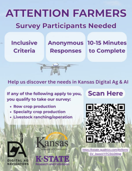 Kansas farmers are invited to share their insights on digital agriculture and artificial intelligence (AI) in farming. This short survey will help identify opportunities, challenges, and resource needs as these technologies expand across the state. Participation is anonymous and takes less than 10 minutes.